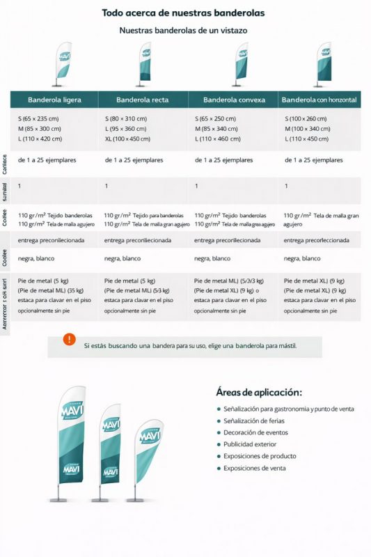 En GRUPO MAVI le ofrecemos una gran selección de diversas banderas para conseguir que su publicidad sea lo más eficiente y de la mayor calidad posible. Por este motivo, no solo podrá elegir entre cuatro tamaños distintos (S, M, L, XL, de 200 a 450 cm), sino también pedir la adaptación de la forma de las banderas a sus necesidades.