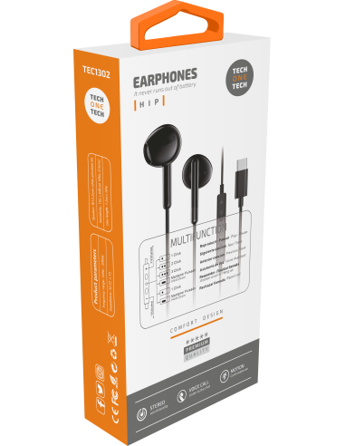 Especificaciones Auriculares HIP ergonómicos, sonido estéreo, con micrófono, controles de volumen y tercer botón multifunción. Música y llamadas: Amplio rango de frecuencias para una experiencia de música óptima y llamadas de voz. Longitud: Cable 1,2 mt Conector: USB-C Digital Micrófono: -42dB +-3dB